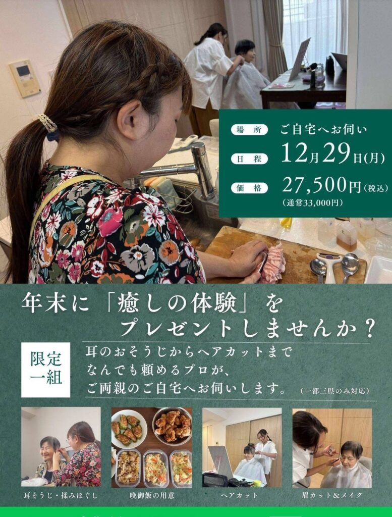 介護福祉士と家事代行サービスのプロ経験と、新たに学んだ技術を活かしたメニューで非日常の癒し体験を!お年賀、母の日、父の日、誕生日、、季節のプレゼントにいかがですか☺